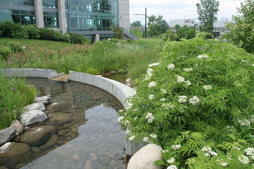 Les changements climatiques et les événements météorologiques extrêmes qui en découlent exercent une pression réelle sur les infrastructures municipales de captation des eaux pluviales. Parallèlement, les nappes phréatiques peinent à se renouveler et la qualité de l’eau est dégradée par les activités humaines. Les systèmes végétalisés de gestion des eaux pluviales ont pour objectifs de limiter ces problèmes. Incluant des ouvrages de rétention, d'infiltration, de transport, d'évapotranspiration et de filtration, ces aménagements d’un genre nouveau permettent à l’eau de pluie de pénétrer plus efficacement et plus rapidement dans le sol et de s’en voir purifiée naturellement. Parmi les ouvrages de gestion des eaux pluviales dans lesquels les plantes indigènes d’Aiglon Indigo peuvent être utilisées, on retrouve les toitures végétalisées, les noues, les bandes filtrantes, les zones de biorétention, les bassins de rétention et d’infiltration végétalisée et les marais filtrants.